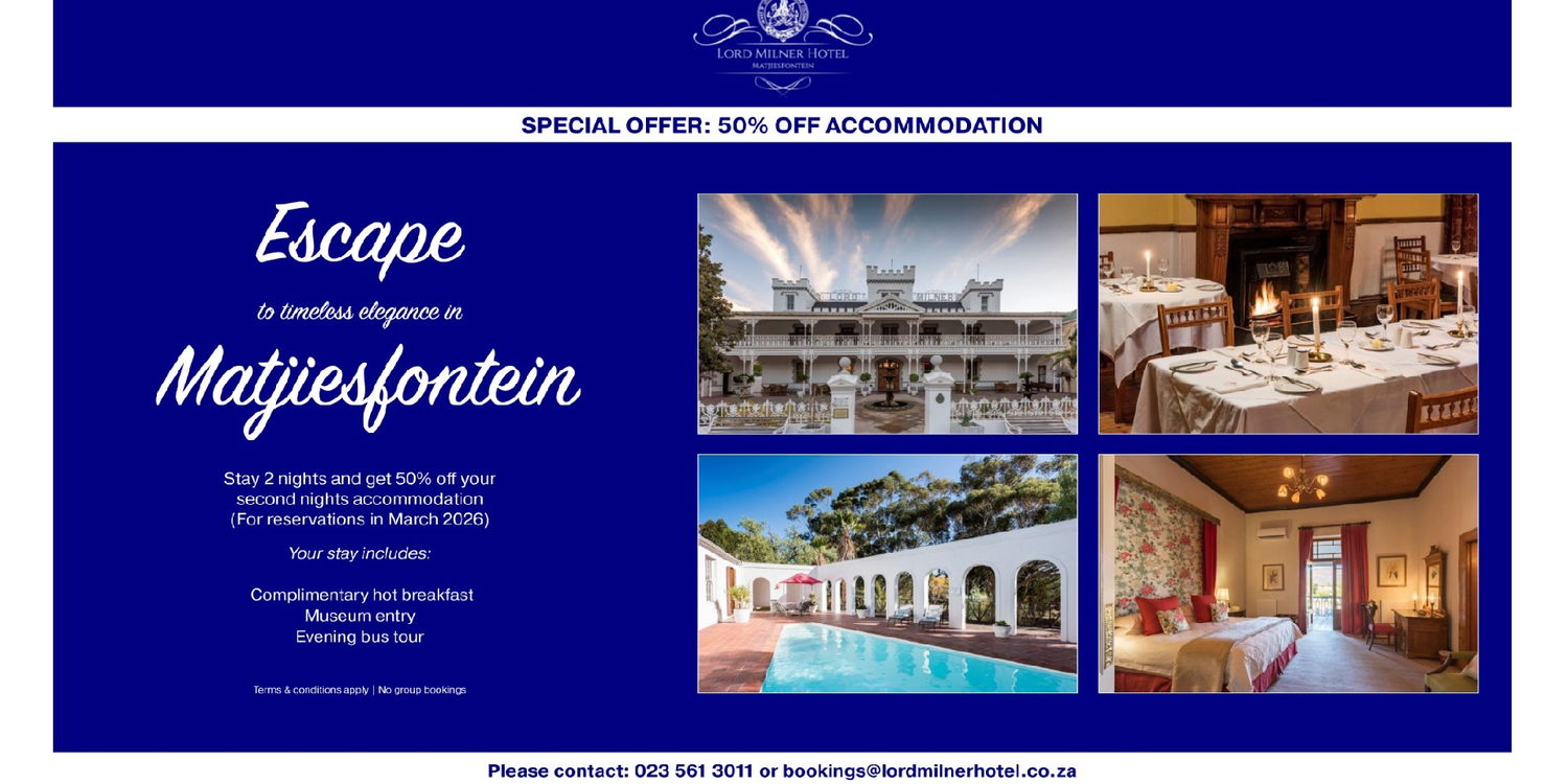 Take a trip on the Old London Bus, let yourself be summoned to dinner by trumpet, soak up the history in the Transport or Victorian museums, take in the uniqueness of the Karoo with veld walks, hikes and mountain bikes, visit the Boer War British Army remount encampment site (c.1900) nearby, play a game of tennis, or simply relax, and read in of the hotel's opulent lounges or by the residents only pool.
